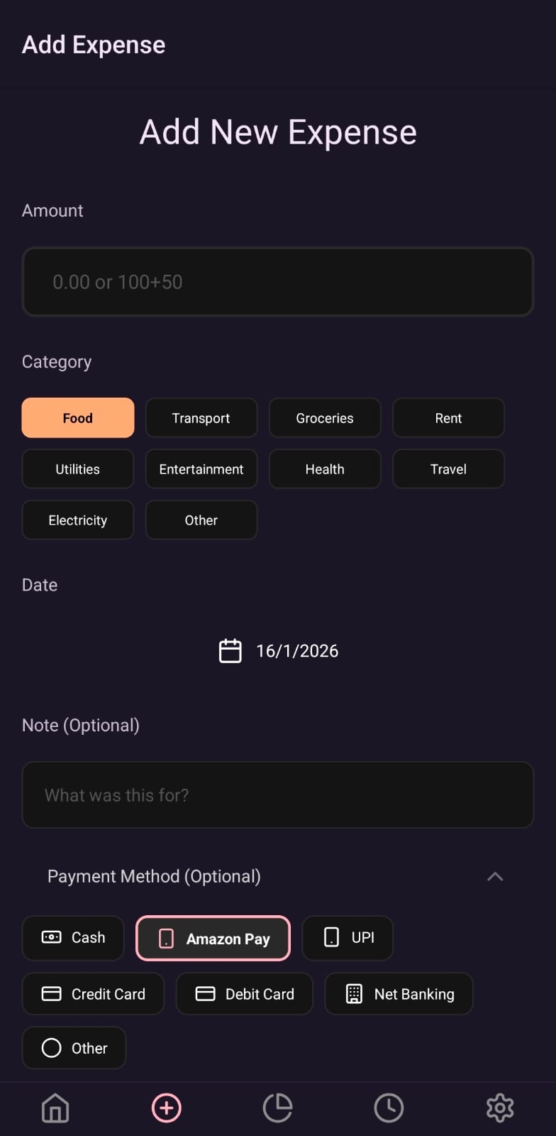 Adding an expense should be boring—in a good way. It’s a one‑screen flow with quick category and payment method picks so I can log something in a few seconds and move on.