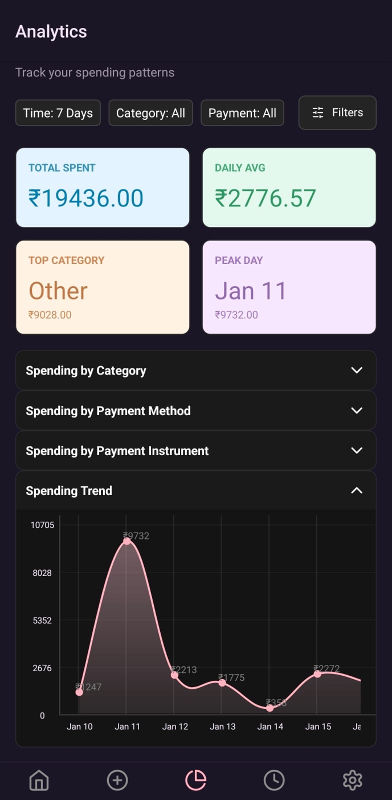 - Analytics that go deeper: category and payment method breakdowns, instrument‑level splits, plus a spending trend chart