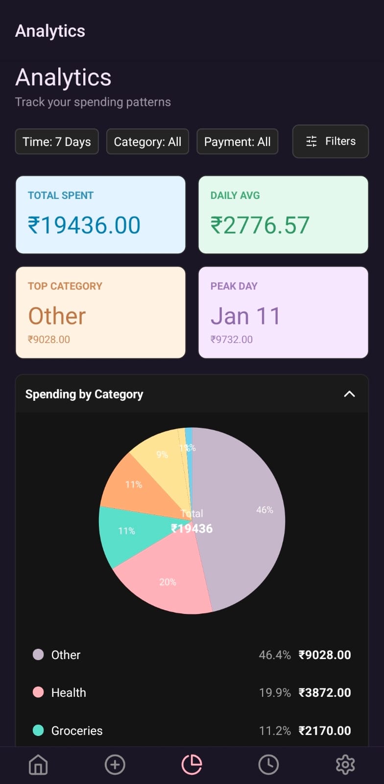 I wanted answers, not charts for the sake of charts. The analytics tab helps me see where money goes by category, payment method, and saved instrument, then zoom out with a spending trend view. I also added multiple time windows so I can compare “this week” vs. “the last 3 months” without leaving the screen.