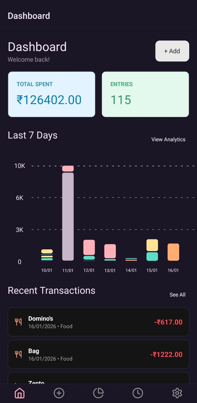 The dashboard is my “daily check‑in” screen. It gives me a quick view of recent spending and a simple 7‑day trend. I made the graph tappable because I kept wanting to jump straight into that day’s entries.