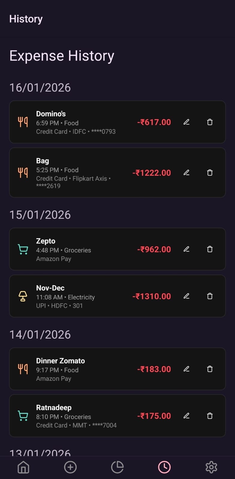 - Edit expenses anytime with a full history view to revisit and update past entries