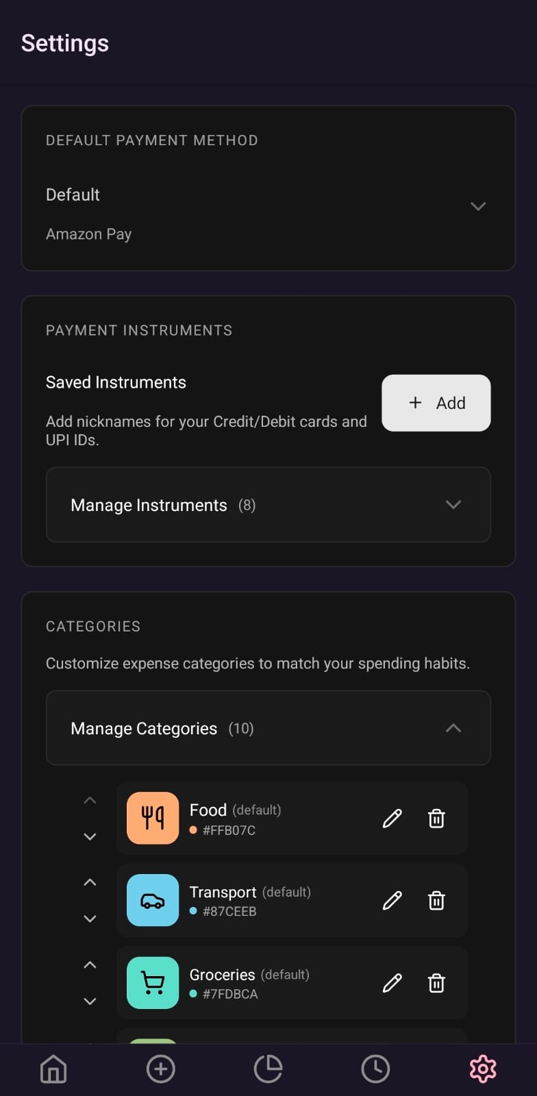 Settings are intentionally boring. You can set a default payment method, add custom categories (the app ships with 8 defaults you can edit), manage saved payment instruments for deeper analytics, and enable GitHub sync to keep everything in sync across devices. Auto‑sync can run on change or on app launch.